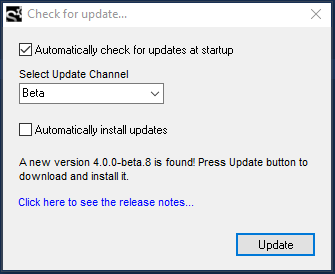 Updates are available under different channels. The Stable channel provides full releases of Sanny Builder. The Beta channels provides intermediate beta releases that might be unstable but give you early access to new features.