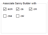 You may associate different file extensions with Sanny Builder. When a checkbox is selected, your Windows Registry is changed and you may open the files with this extension simply by clicking it. To remove the association, unselect the checkbox.